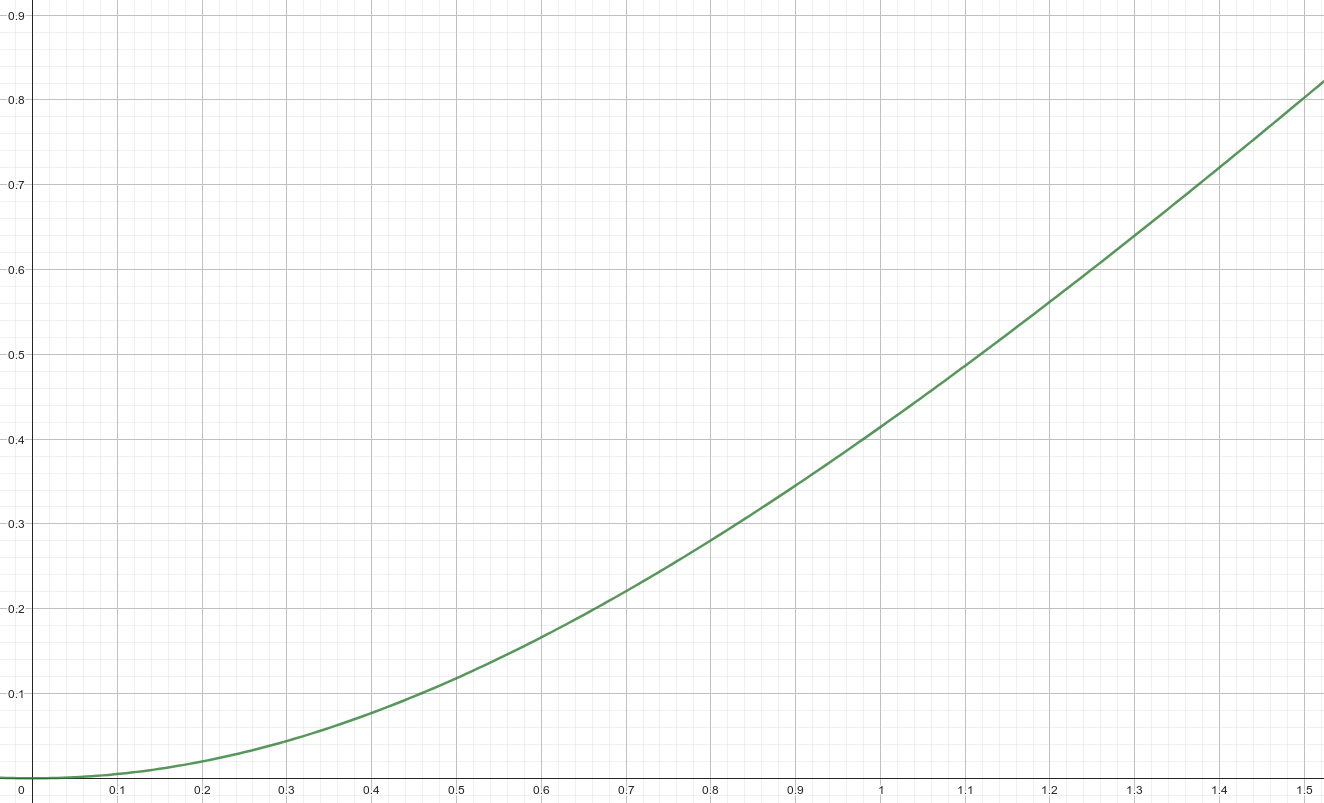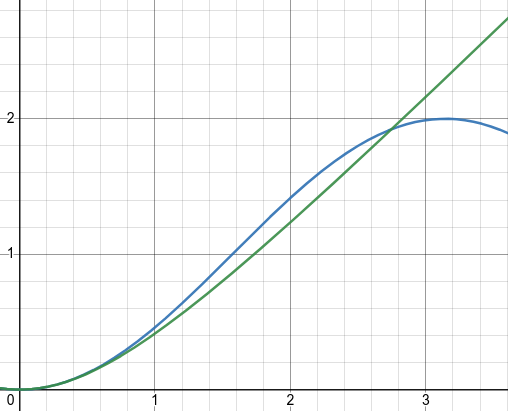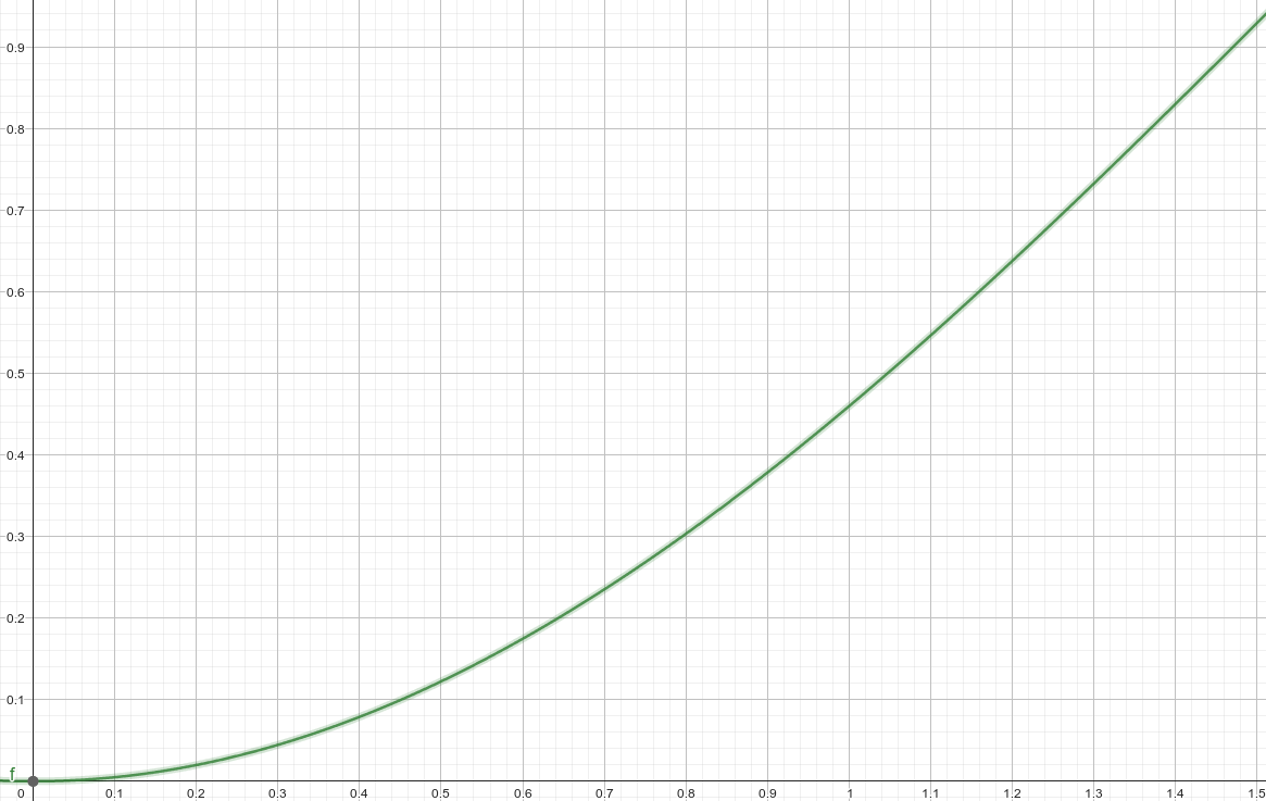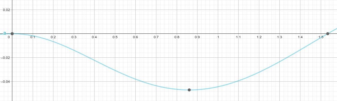 Using the notation above with \(r = 1\) and \(h = 1\), the top section will produce slack similar to a cosine (horizontal axis is the angle \(\alpha\), vertical is the amount of “slack” given): \[ 1-\cos\alpha \]