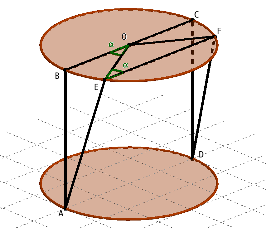 We can model the position of the string as in figure below (where I omitted for clarity the lateral surface of the cylinder): its initial position is along path \(ABCD\), but we can study what happens if it follows a slightly displaced path \(AEFD\), where \(AE\) and \(DF\) are geodesic on the cylinder, i.e. straight lines on its unfolding.