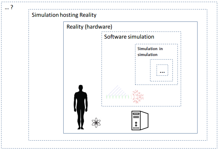 The figure above shows the infinite regression of simulations. So what’s the difference between hardware and software? Well, the simple answer is that we live at the same reality level than our hardware. An entity living in a computer simulation would pretty much consider the simulation artifacts as real and tangible hardware.