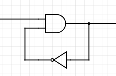 If both inputs of the AND gate are 1, then the output will be 1. This will bring a 0 back to the AND gate because of the NOT gate. This will then set 0 to the output, and the cycle continues.