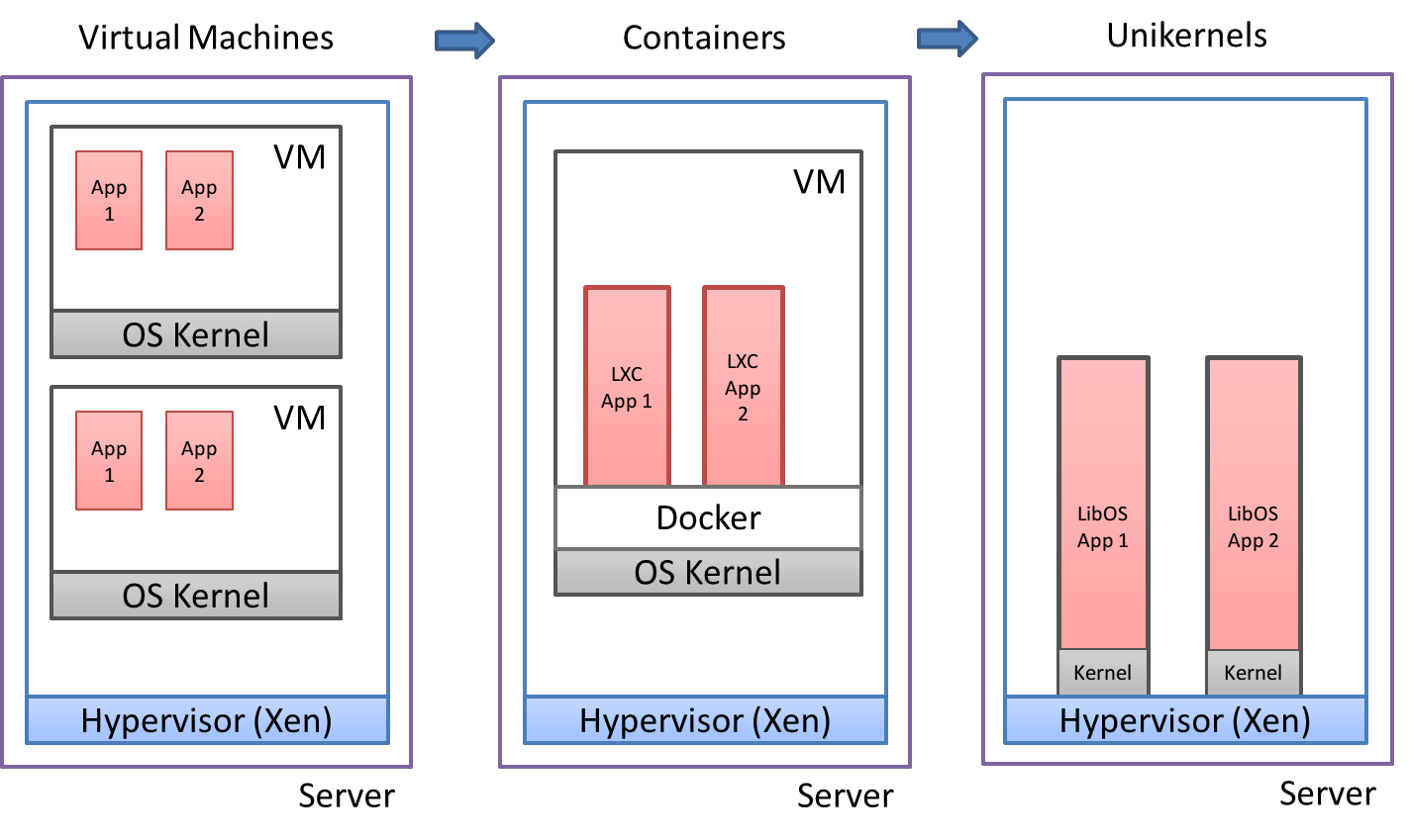 The next, ultimate step in this progression is the Unikernel. A Unikernel is an application compiled together with a so-called “Library OS”. The result of this compilation is not an executable than should run on top of an OS: it is itself an OS. The compiled Unikernel runs directly on Xen. As such, Unikernels can be viewed as single-purpose barebone VMs. The advantages of this technology are multiple: