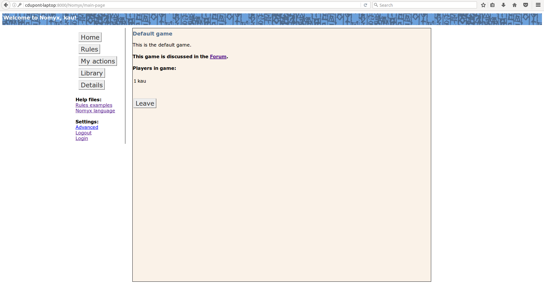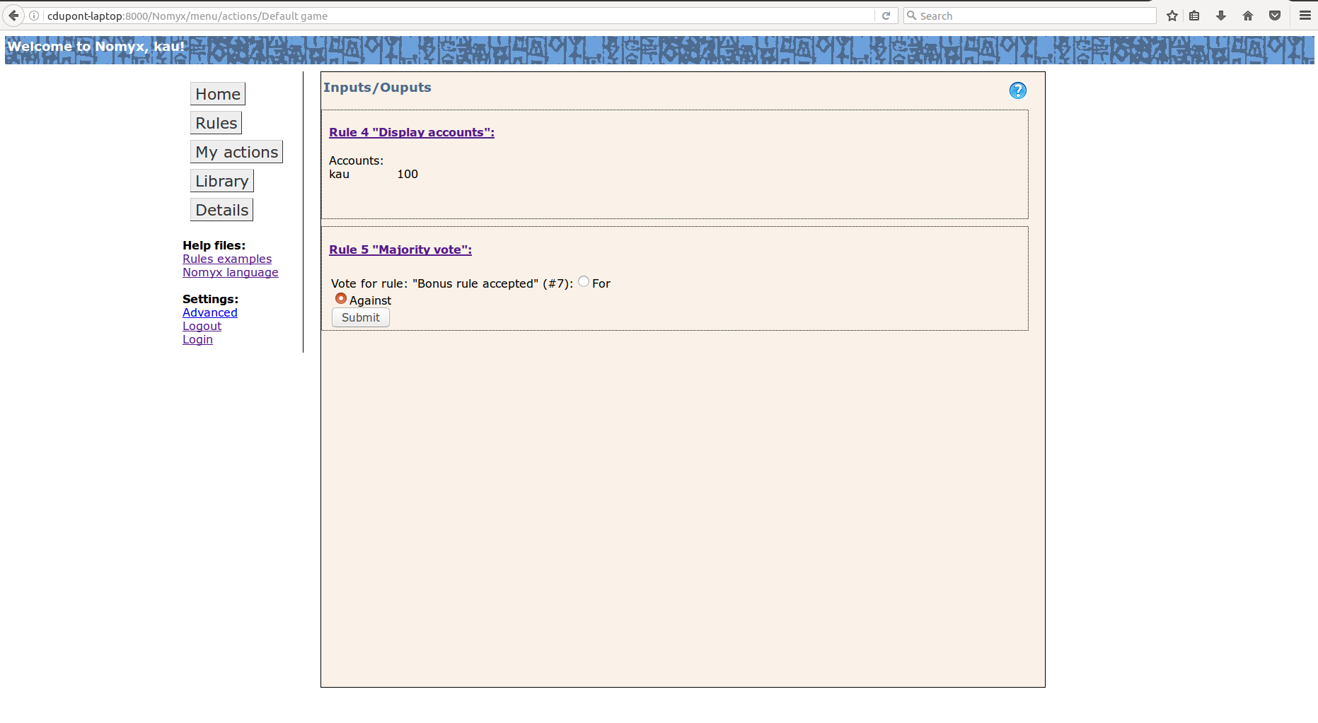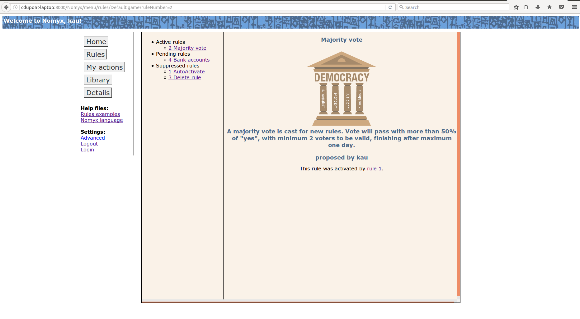 - An API and client application, allowing to play Nomyx from the command line. This allows you to develop your own rules in Haskell with your preferred tools (emacs, vim…) and sharing them in GIT.